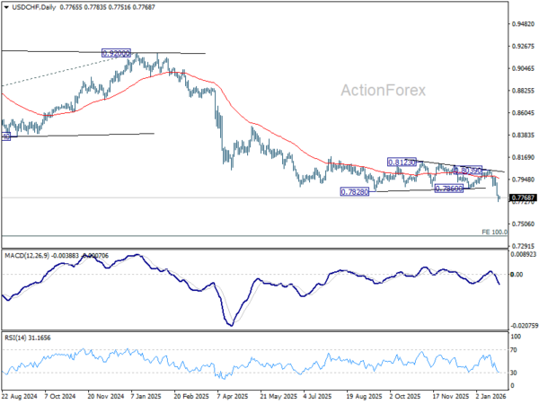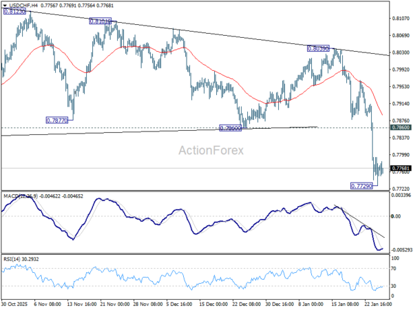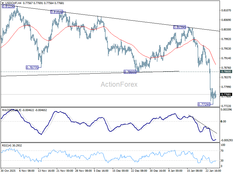 Intraday bias in USD/CHF is turned neutral with 4H MACD crossed above signal line, and some consolidations would be seen. But upside of recovery should be limited by 0.7860 support turned resistance. On the downside, break of 0.7729 will resume larger down trend to 0.7382 projection level.