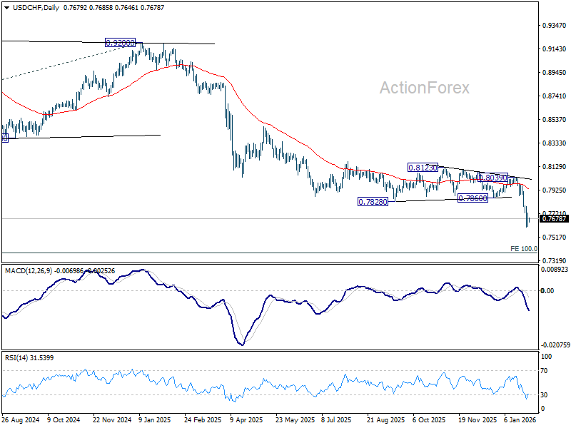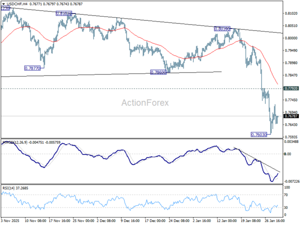 Intraday bias in USD/CHF remains neutral for consolidations above 0.7603 temporary top. Outlook will stay bearish as long as 0.7792 resistance holds Break of 0.7603 will resume the larger down trend to 0.7382 projection level next. However, firm break of 0.7792 will turn bias back to the upside, for stronger rebound to 0.7860 support turned resistance.