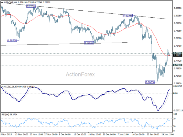 Breach of 0.7792 resistance suggests short term bottoming at 0.7603 in USD/CHF. Intraday bias is mildly on the upside for stronger rebound to 55 D EMA (now at 0.7912). On the downside, below 0.7713 minor support will bring retest of 0.7603. Firm break there will resume larger down trend to 0.7382 projection level next.