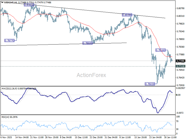 Intraday bias in USD/CHF is turned neutral first with current retreat. Above 0.7816 will resume the rebound from 0.7603 short term bottom to 55 D EMA (now at 0.7905). On the downside, below 0.7713 minor support will bring retest of 0.7603. Firm break there will resume larger down trend to 0.7382 projection level next.