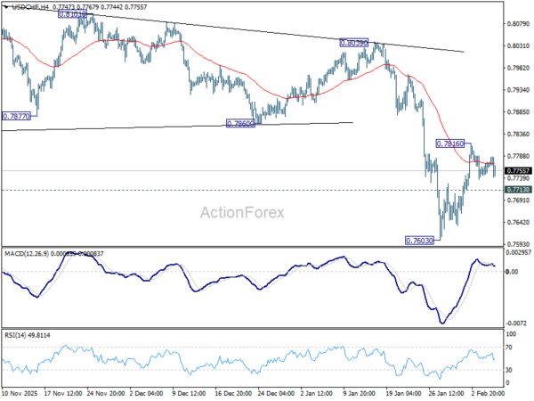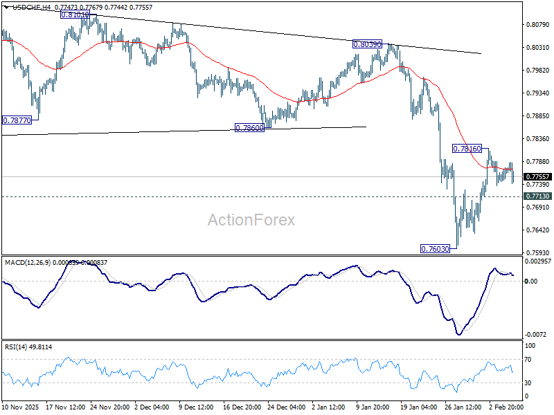 Intraday bias in USD/CHF stays neutral and outlook is unchanged. On the upside, above 0.7816 will resume the rebound from 0.7603 short term bottom to 55 D EMA (now at 0.7905). On the downside, below 0.7713 minor support will bring retest of 0.7603. Firm break there will resume larger down trend to 0.7382 projection level next.