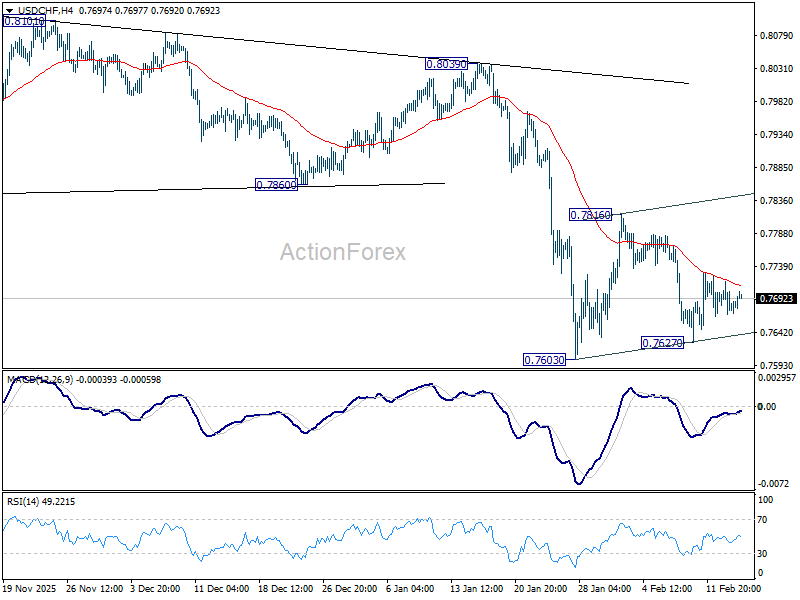 Outlook is unchanged for USD/CHF. Consolidation pattern from 0.7603 is extending and intraday bias stays neutral. Stronger rebound cannot be ruled out but upside should be limited by 55 D EMA (now at 0.7855) to complete the pattern. On the downside, break of 0.7603 will resume larger down trend, and target 0.7382 projection level next.