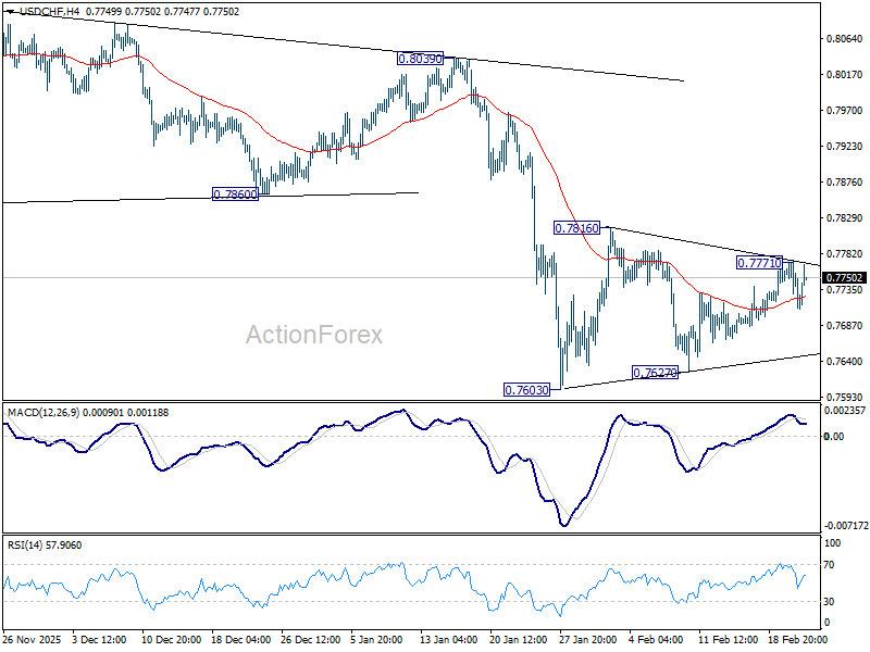 USD/CHF recovered after hitting 55 4H EMA, but stays below 0.7771 temporary top. Intraday bias remains neutral first. Consolidation pattern from 0.7603 could extend further. In case of stronger rise, upside upside should be limited by 55 D EMA (now at 0.7834) to complete the pattern. On the downside, below 0.7627 will bring retest of 0.7603. Firm break there will resume larger down trend, and target 0.7382 projection level next. However, sustained break of 55 D EMA will indicate that a larger scale corrective bounce in underway and target 0.8039 resistance next.