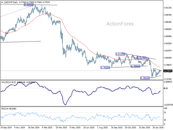Intraday bias in USD/CHF stays neutral for the moment and consolidation pattern from 0.7603 is still in progress. In case of stronger rise, upside upside should be limited by 55 D EMA (now at 0.7832) to complete the pattern. On the downside, below 0.7627 will bring retest of 0.7603. Firm break there will resume larger down trend, and target 0.7382 projection level next. However, sustained break of 55 D EMA will indicate that a larger scale corrective bounce in underway and target 0.8039 resistance next.