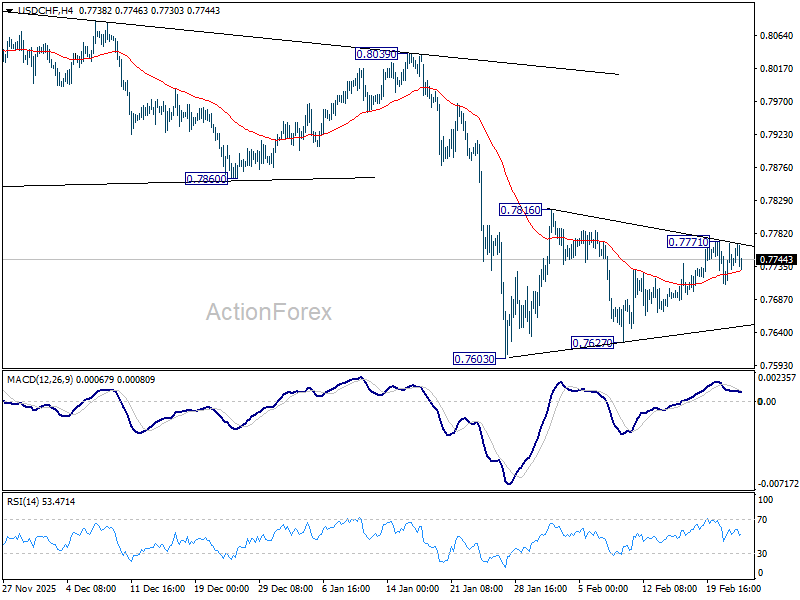 Range trading continues in USD/CHF and intraday bias stays neutral. Consolidation pattern from 0.7603 is still in progress. In case of stronger rise, upside upside should be limited by 55 D EMA (now at 0.7832) to complete the pattern. On the downside, below 0.7627 will bring retest of 0.7603. Firm break there will resume larger down trend, and target 0.7382 projection level next. However, sustained break of 55 D EMA will indicate that a larger scale corrective bounce in underway and target 0.8039 resistance next.