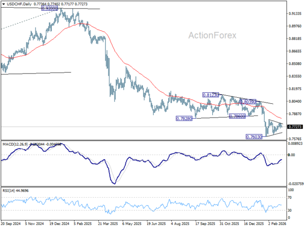 Intraday bias in USD/CHF remains neutral for the moment and outlook is unchanged. Consolidation pattern from 0.7603 is still in progress. In case of stronger rise, upside upside should be limited by 55 D EMA (now at 0.7828) to complete the pattern. On the downside, below 0.7627 will bring retest of 0.7603. Firm break there will resume larger down trend, and target 0.7382 projection level next. However, sustained break of 55 D EMA will indicate that a larger scale corrective bounce in underway and target 0.8039 resistance next.