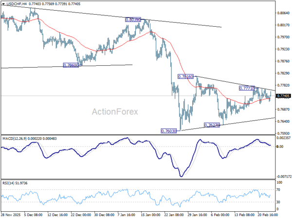 Range trading continues in USD/CHF and intraday bias stays neutral. Consolidation pattern from 0.7603 is still in progress. In case of stronger rise, upside upside should be limited by 55 D EMA (now at 0.7828) to complete the pattern. On the downside, below 0.7627 will bring retest of 0.7603. Firm break there will resume larger down trend, and target 0.7382 projection level next. However, sustained break of 55 D EMA will indicate that a larger scale corrective bounce in underway and target 0.8039 resistance next.