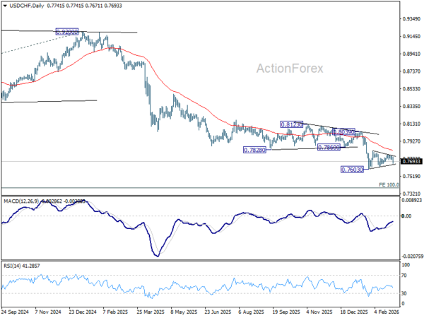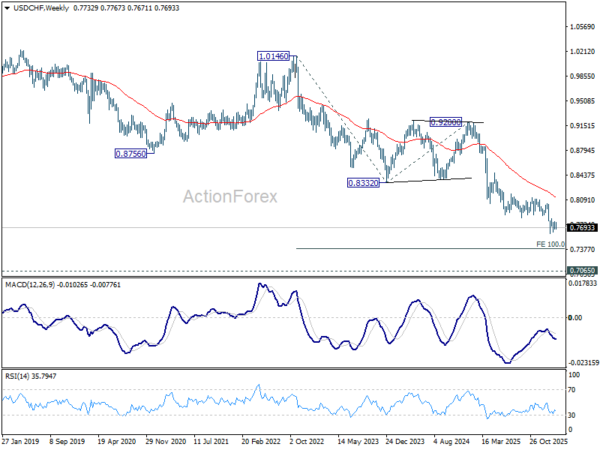 USD/CHF stays in consolidations above 0.7603 last week and outlook is unchanged. Initial bias stays neutral this week first. In case of another rise, upside should be limited by 55 D EMA (now at 0.7824). On the downside, break of 0.7603 will resume larger down trend, and target 0.7382 projection level next. However, sustained break of 55 D EMA will indicate that a larger scale corrective bounce in underway and target 0.8039 resistance next.