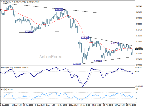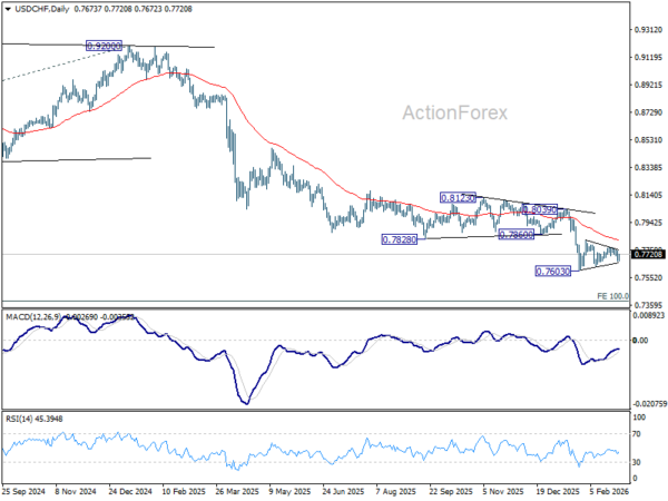 USD/CHF recovered today but stays in established range. Intraday bias remains neutral for the moment. In case of another rise, upside should be limited by 55 D EMA (now at 0.7816). On the downside, break of 0.7603 will resume larger down trend, and target 0.7382 projection level next. However, sustained break of 55 D EMA will indicate that a larger scale corrective bounce in underway and target 0.8039 resistance next.