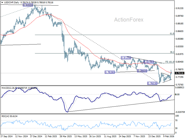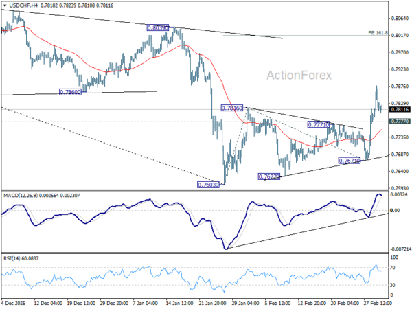 Intraday bias in USD/CHF stays mildly on the upside at this point. Rebound from 0.7603 is seen as correcting the whole fall from 0.9022. Further rise should be seen to 161.8% projection of 0.7603 to 0.7816 from 0.7671 at 0.8016. On the downside, though, below 0.7777 minor support will turn bias neutral again first.