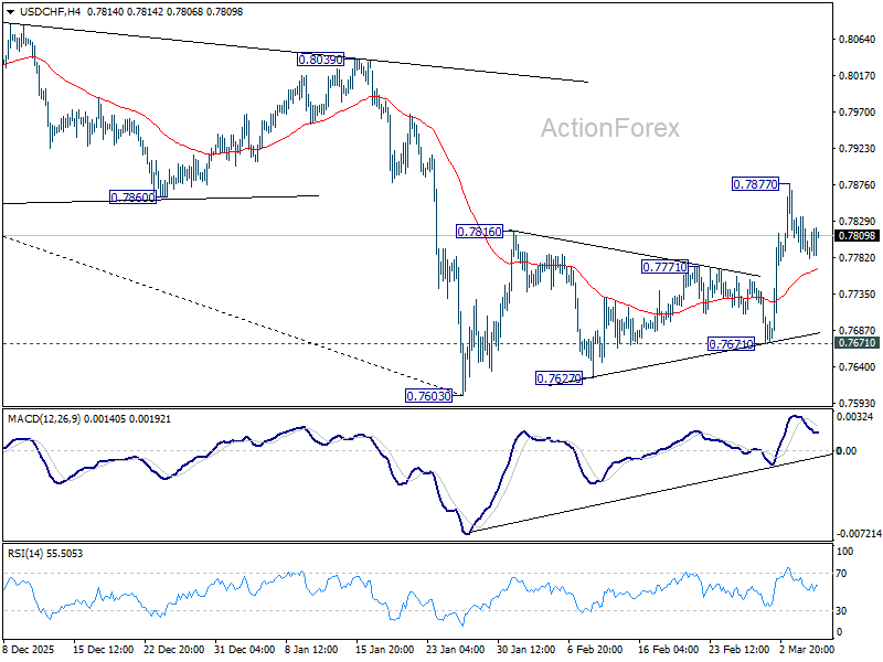 No change in USD/CHF’s outlook and intraday bias remains neutral. More consolidations could be seen below 0.7877 temporary top first. Further rise is expected as long as 0.7671 support holds. Rebound from 0.7603 is seen as correcting the whole fall from 0.9022. Above 0.76877 will target 0.8039 resistance next.