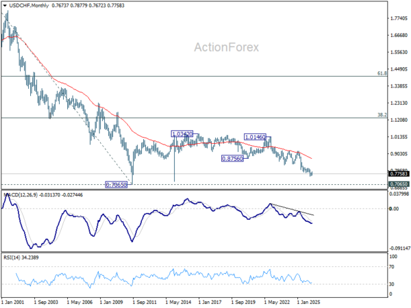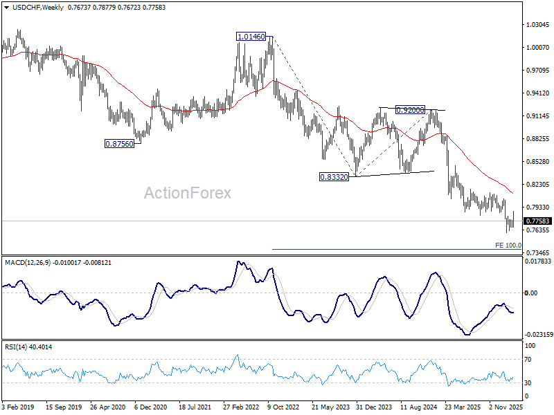 USD/CHF rebounded further to 0.7877 last week but failed to sustain above 55 D EMA (now at 0.7817) and retreated. Initial bias remains neutral this week first. On the downside, break of 0.7671 support will revive near term bearishness and bring retest of 0.7603 low. Decisive break there will resume larger down trend. On the upside, though, break of 0.7877 will bring stronger rally to 0.8039 resistance next.