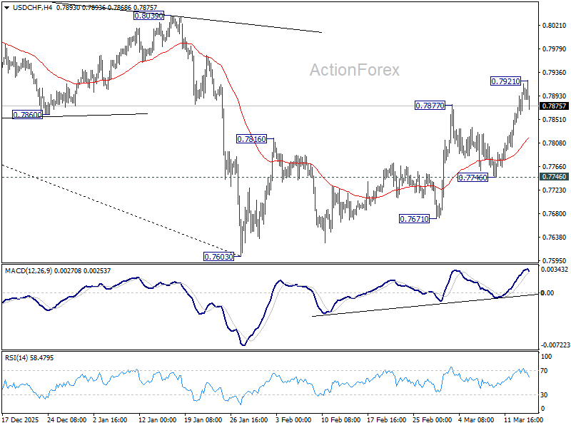 A temporary top is in place at 0.7921 in USD/CHF and intraday bias is turned neutral first. Some consolidations would be seen but further rally is in favor as long as 0.7746 support holds. Rise from 0.7603 is seen as correcting whole down trend from 0.9200. Break of 0.7921 will target 38.2% retracement of 0.9200 to 0.7603 at 0.8213.