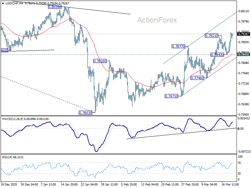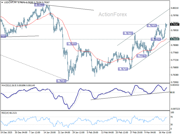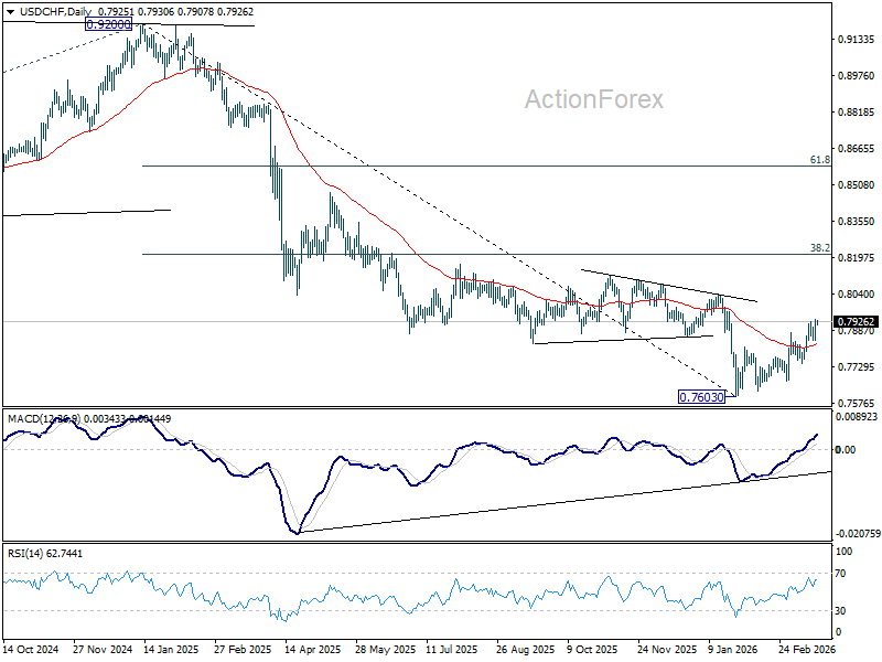 USD/CHF’s rise from 0.7603 resumed by breaking through 0.7921 temporary top. Intraday bias is back on the upside. The current rally is seen as correcting whole down trend from 0.9200. Next target is 38.2% retracement of 0.9200 to 0.7603 at 0.8213. On the downside, below 0.7842 support will turn intraday bias neutral first.