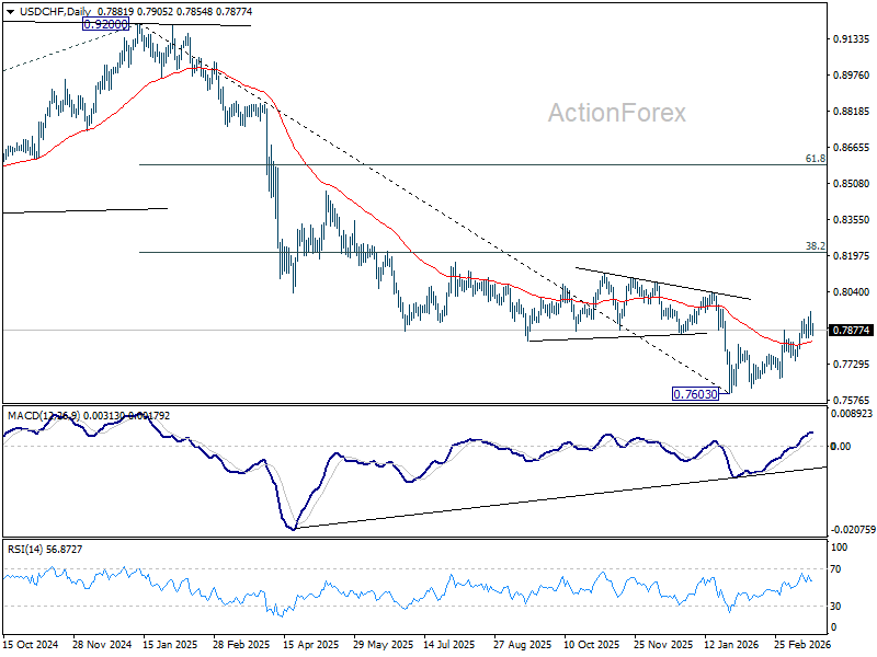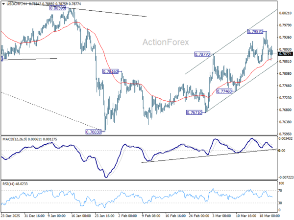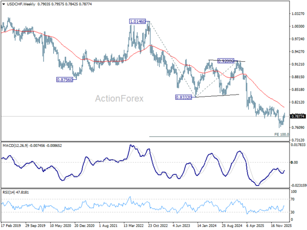 USD/CHF edged higher to 0.7957 last week but retreated. Initial bias remains neutral this week first. As noted before, rise from 0.7603 should be corrective whole decline from 0.9200. Above 0.7957 will target 38.2% retracement of 0.9200 to 0.7603 at 0.8213. This will remain the favored case as long as 0.7746 support holds.