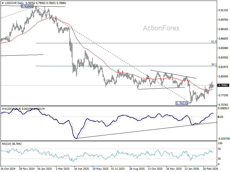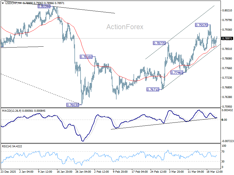 Intraday bias in USD/CHF stays neutral for the moment and more consolidations could be seen below 0.7957. As noted before, rise from 0.7603 should be correcting whole decline from 0.9200. Above 0.7957 will target 38.2% retracement of 0.9200 to 0.7603 at 0.8213. This will remain the favored case as long as 0.7746 support holds.