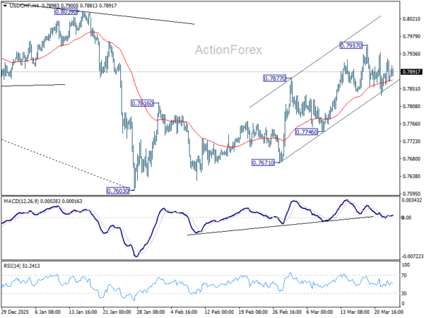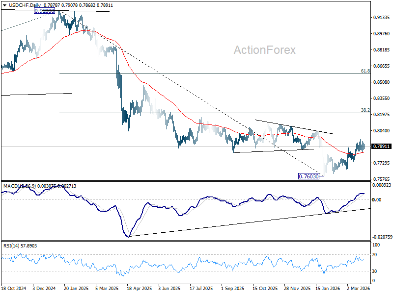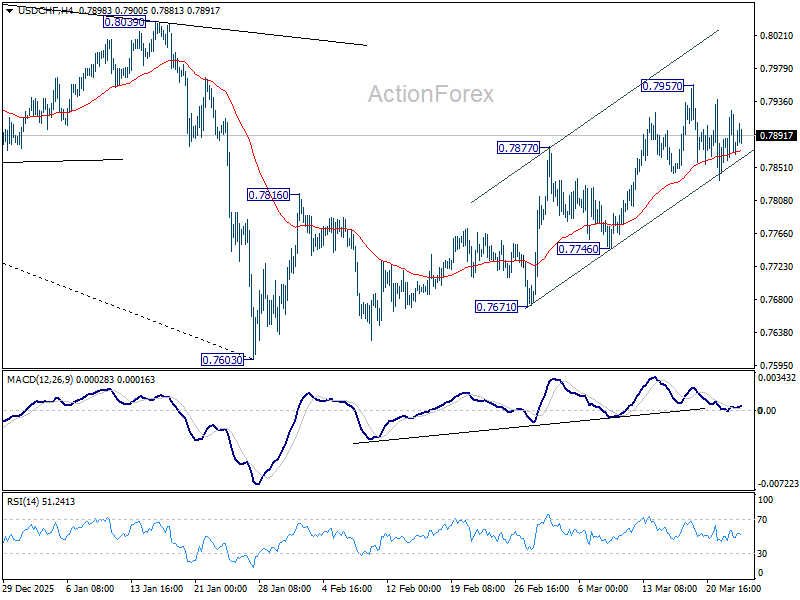 USD/CHF is still bounded in consolidations below 0.7957 and intraday bias stays neutral. As noted before, rise from 0.7603 should be correcting whole decline from 0.9200. Above 0.7957 will target 38.2% retracement of 0.9200 to 0.7603 at 0.8213. This will remain the favored case as long as 0.7746 support holds.