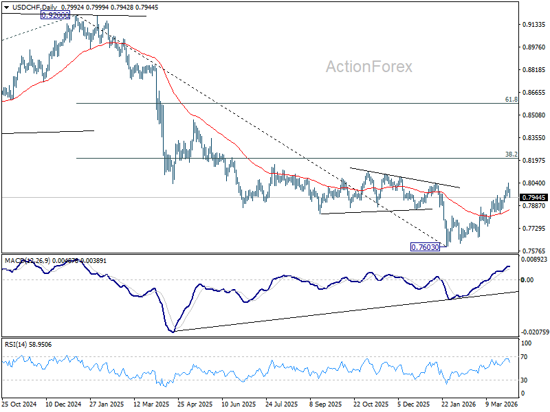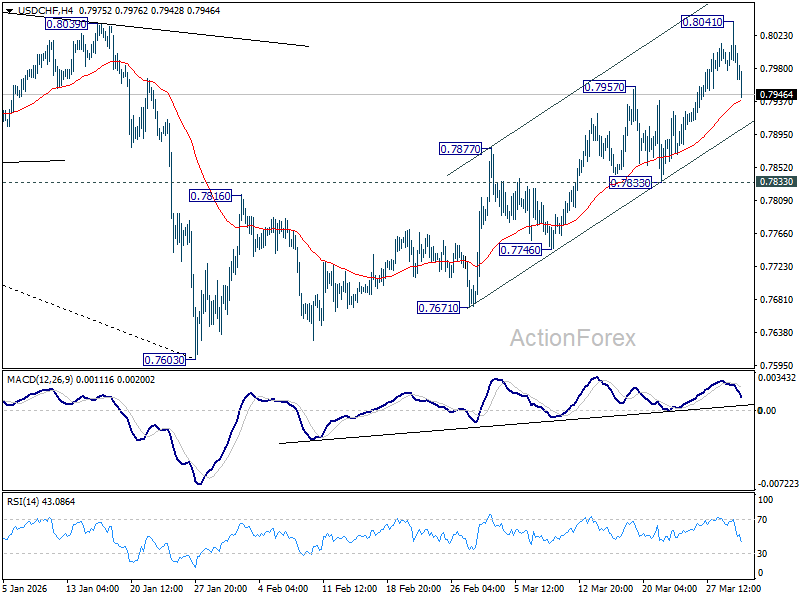 A temporary top is formed at 0.8041 with current retreat, and intraday bias in USD/CHF is turned neutral first. On the upside, break of 0.8041 will resume the whole rally from 0.7603, and target 38.2% retracement of 0.9200 to 0.7603 at 0.8213. However, decisive break of 0.7833 support will argue that the rebound has completed, and turn bias back to the downside for deeper fall.