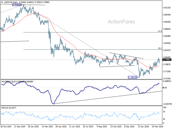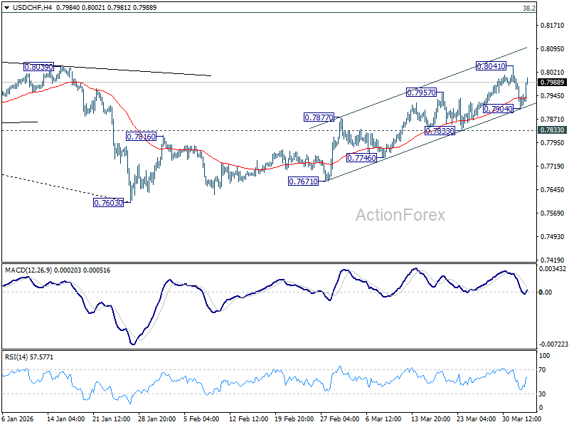 USD/CHF recovered after drawing support from near-term rising channel floor, but stays below 0.8041 temporary top. Intraday bias remains neutral first and further rally is in favor. On the upside, break of 0.8041 will resume the whole rally from 0.7603, and target 38.2% retracement of 0.9200 to 0.7603 at 0.8213. However, decisive break of 0.7833 support will argue that the rebound has completed, and turn bias back to the downside for deeper fall.