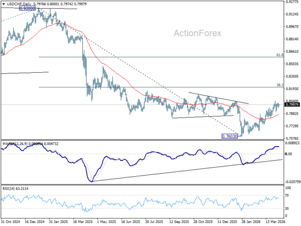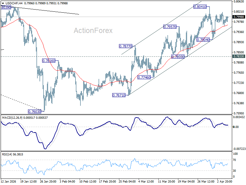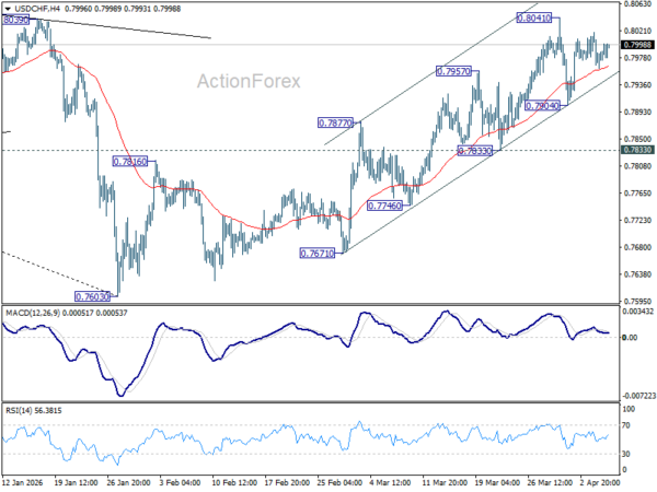 Intraday bias in USD/CHF stays neutral as consolidation from 0.8041 is still extending. Further rally is expected with 0.7833 support intact. On the upside, break of 0.8041 will resume the whole rally from 0.7603, and target 38.2% retracement of 0.9200 to 0.7603 at 0.8213. However, decisive break of 0.7833 support will argue that the rebound has completed, and turn bias back to the downside for deeper fall.