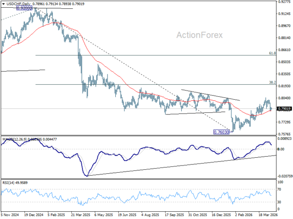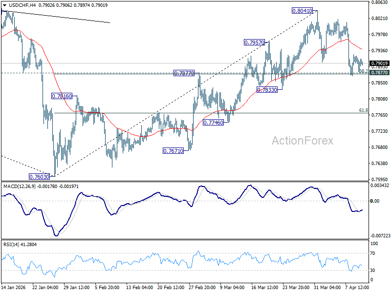 Intraday bias in USD/CHF remains neutral and outlook is unchanged. With 0.7877 cluster support (38.2% retracement of 0.7603 to 0.8041 at 0.7874) intact, rally from 0.7603 is expected to resume through 0.8041 later. However, decisive break of 0.7874/7 will argue that the rise has completed, and bring deeper fall to 61.8% retracement at 0.7770 and below.