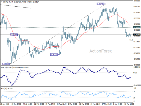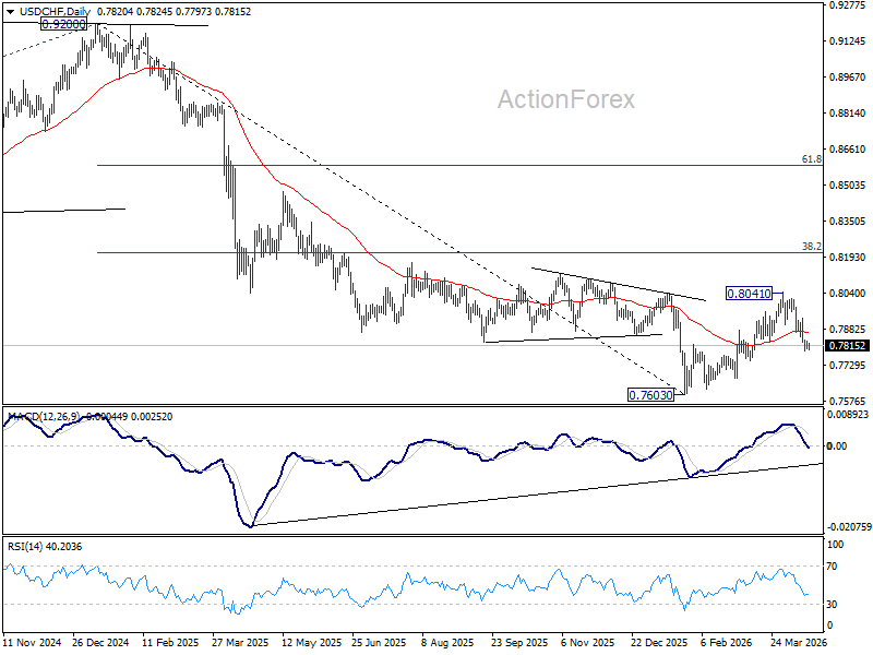 Further decline is still expected in USD/CHF with 0.7868 minor resistance intact. Fall from 0.8041 should target 61.8% retracement of 0.7603 to 0.8041 at 0.7770. Decisive break there will target a retest on 0.7603 low. On the upside, above 0.7868 minor resistance will turn intraday bias neutral first.