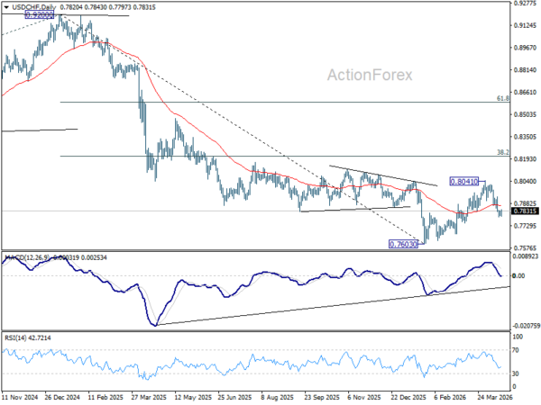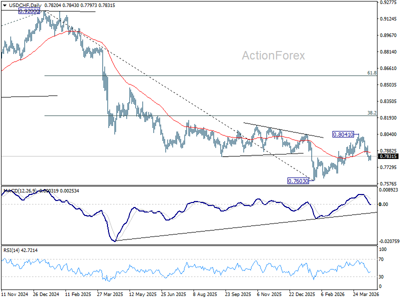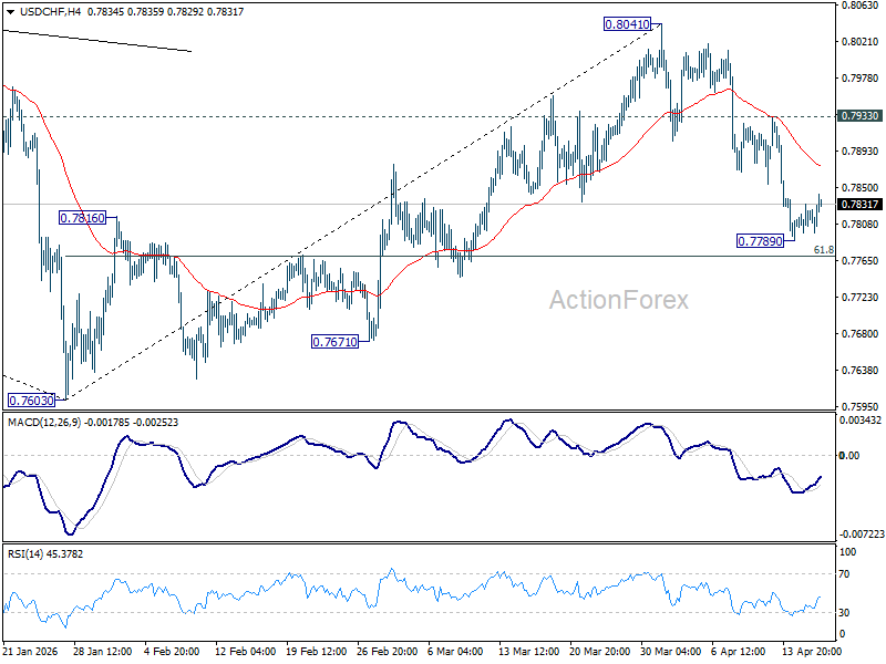 Intraday bias in USD/CHF is turned neutral first with current recovery. Some consolidations would be seen and further decline is expected as long as 0.7933 resistance holds. Below 0.7789 will resume the fall from 0.8041 to 61.8% retracement of 0.7603 to 0.8041 at 0.7770. Decisive break there will target a retest on 0.7603 low.