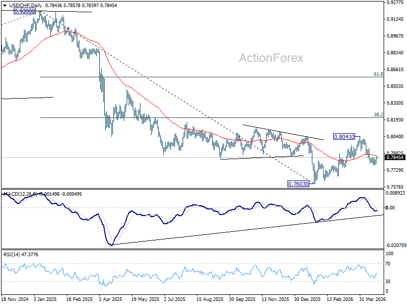 USD/CHF is staying inc consolidations above 0.7774 and intraday bias remains neutral. Stronger recovery might be seen but upside should be limited below 0.7933 resistance to bring another fall. Sustained break of 61.8% retracement of 0.7603 to 0.8041 at 0.7770 will resume the decline from 0.8041 to retest 0.7603 low.