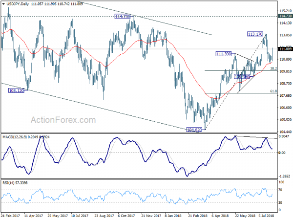 USD/JPY’s strong rebound and firm break of 110.58 minor resistance indicates that pull back from 113.17 has completed at 110.58 already. Intraday bias is back on the upside for retesting 113.17 first. Break there will resume larger rally from 104.62 for 114.73 key resistance. On the downside, below 110.58 will extend the correction from 113.17. But downside should be contained by 38.2% retracement of 104.62 to 113.17 at 109.90 to bring rebound.