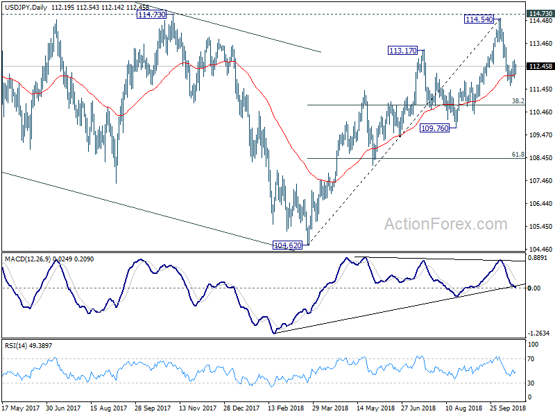 In the bigger picture, corrective fall from 118.65 (2016 high) should have completed with three waves down to 104.62. Decisive break of 114.73 resistance will likely resume whole rally from 98.97 (2016 low) to 100% projection of 98.97 to 118.65 from 104.62 at 124.30, which is reasonably close to 125.85 (2015 high). This will stay as the preferred case as long as 109.76 support holds. However, decisive break of 109.76 will dampen this bullish view and turns outlook mixed again.