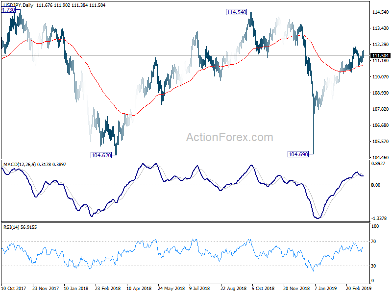 In the bigger picture, strong rebound from 104.69 argues that decline from 118.65 (2016 high) has completed with three waves down to 104.69, after failing 104.62. More importantly, the rise from 98.97 (2016 low) could be resuming. Decisive break of 114.54 resistance will add more credence to this bullish case and target 118.65. This will now be the favored case as long as 110.35 support holds. However, firm break of 110.35 will mix up the medium term outlook again and turn focus back to 104.69 low.