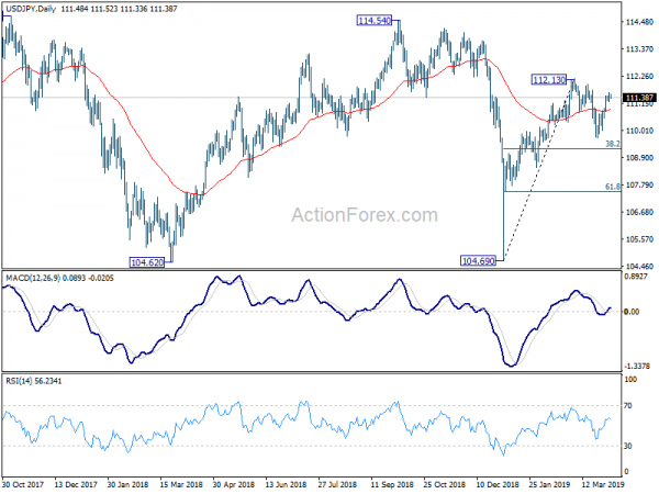 Intraday bias in turned neutral for now with a temporary top formed at 111.57 in USD/JPY. But further rise is mildly in favor as long as 110.80 110.80 minor support holds. Decisive break of 112.13 resistance will resume whole rise from 104.69 to 114.54 key resistance next. On the downside, below 110.80 minor support will turn bias back to the downside for 109.71, and possibly further to 38.2% retracement of 104.69 to 112.13 at 109.28.
