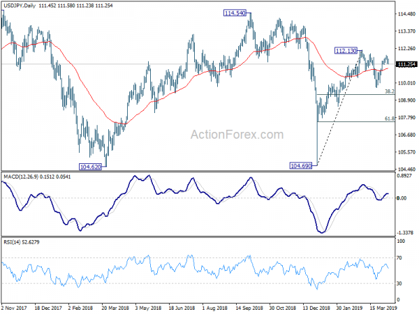 Intraday bias in USD/JPY remains neutral at this point as it’s holding above 111.19 minor support. On the downside, break of 111.18 will likely extend the consolidation from 112.13 with another fall to 109.71 and possibly below, before completion. On the upside, decisive break of 112.13 will resume whole rally from 104.69 and target 114.54 resistance next.