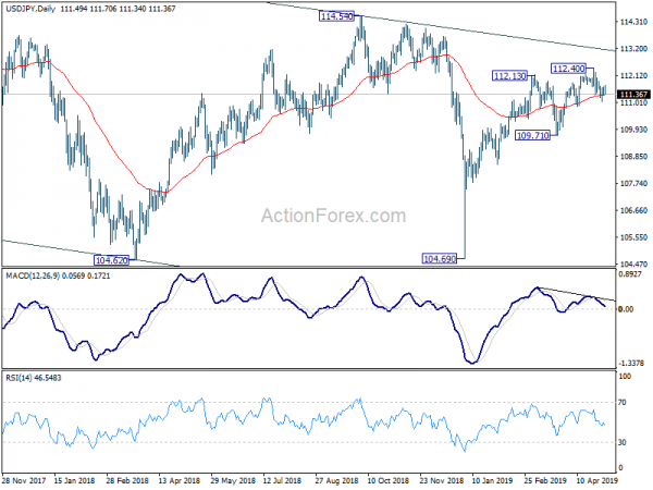 Intraday bias in USD/JPY remains neutral and outlook remains unchanged. Considering bearish divergence condition in daily MACD, risks remain on the downside as long as 112.40 resistance holds. On the downside, decisive break of 110.84 support will add to the case of bearish reversal and target 109.71 support and below. On the upside, firm break of 112.40 resistance will resume the rise from 104.69 instead.