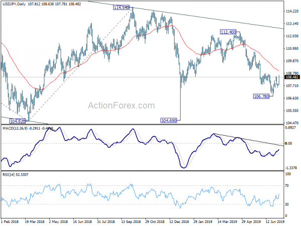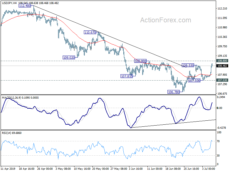 After dipping to 107.53 last week, USD/JPY took a u-turn to resume the rebound from 106.78 through 108.53. Initial focus is now on 108.80 resistance this week. Firm break there will confirm short term bottoming at 106.78. Further rise should then been seen to 110.67 resistance next. On the downside, break of 107.53 will turn bias to the downside for retesting 106.78 low.