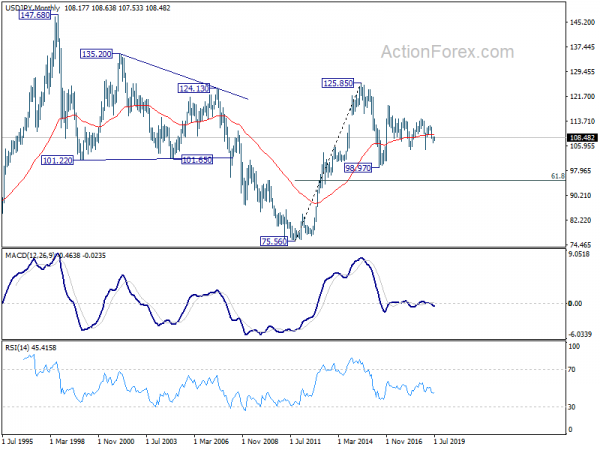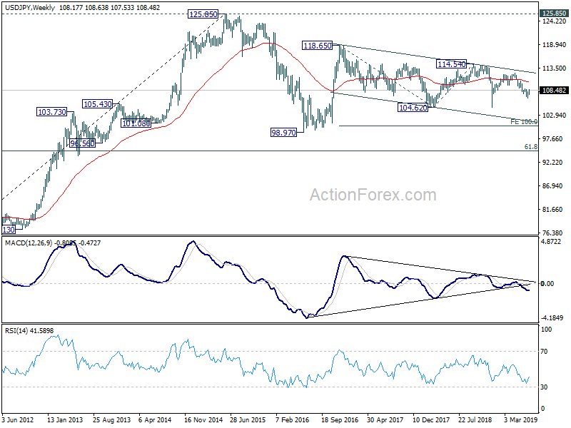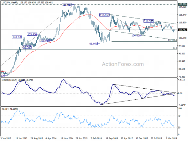 In the bigger picture, decline from 118.65 (Dec 2016) is still in progress, with the pair staying inside long term falling channel. Break of 104.62 will target 100% projection of 118.65 to 104.62 from 114.54 at 100.51. For now, we’d expect strong support above 98.97 (2016 low) to contain downside to bring rebound. In any case, break of 112.40 is needed to the first serious sign of medium term bullishness. Otherwise, further decline will remain in favor in case of rebound.