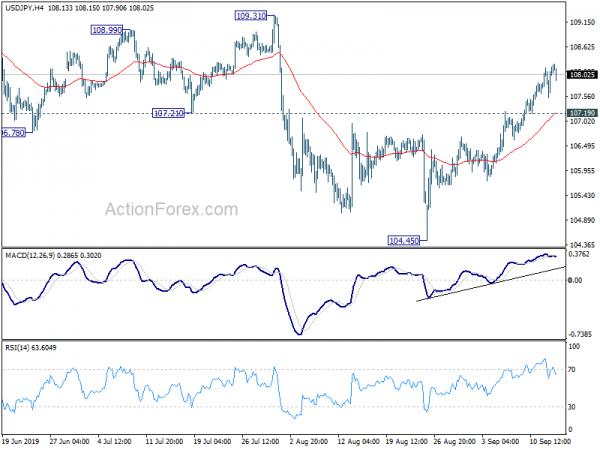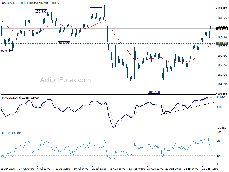 USD/JPY’s rebound from 104.45 resumed after brief retreat. Intraday bias is back on the upside for 109.31 key resistance. We’d continue to look for topping sign as it approaches this 109.31 resistance. On the downside, break of 107.19 minor support will suggest that rebound from 104.45 has completed. Intraday bias will be turned back to the downside for retesting 104.45 low. However, decisive break of 109.31 will carry larger bullish implication.