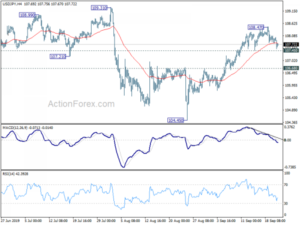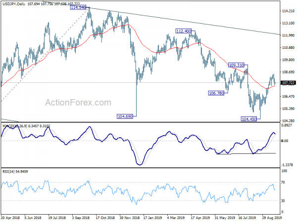 Intraday bias in USD/JPY remains neutral for the moment. On the downside, break of 107.45 minor support will suggest completion of rebound from 104.45. Intraday bias will be turned back to the downside for 106.68 support for confirmation. On the upside, in case of another rally, we’d expect strong resistance below 109.31 to limit upside.