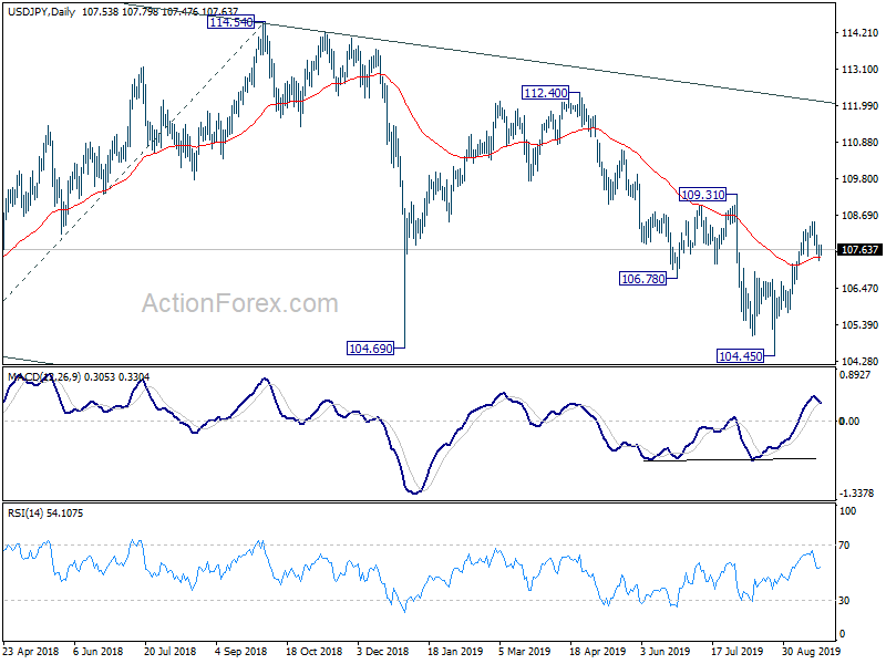 Further decline is still in favor in USD/JPY. Rebound from 104.45 should have completed at 108.47 already. Break of 106.68 will confirm this case and target retest of 104.45 low. On the upside, however, break of 108.47 will extend the rebound towards 109.31 key resistance.
