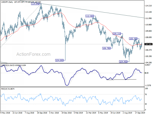 Intraday bias in USD/JPY remains neutral while recovery from 106.48 is extending. We’re still favoring the case that corrective recovery from 104.45 has completed at 108.47. Thus, risk will remain on the downside as long as 108.47 resistance holds. On the downside, break of 106.48 will turn bias back to the downside for retesting 104.45 low. On the upside, break of 108.47 will dampen this view and resume the rebound from 104.45 to 109.31 key resistance.