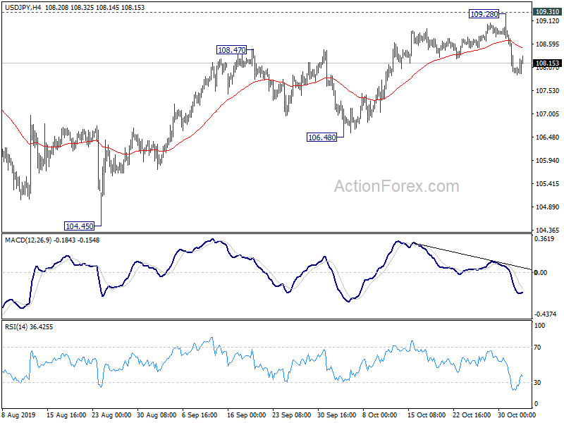 USD/JPY edged higher to 109.28 last week but failed to break through 109.31 key resistance. Considering bearish divergence condition in 4 hour MACD, a short term top should be formed. Initial bias stays on the downside this week for 106.48 support first. Break will confirm completion of whole rebound from 104.45 and target retest of this low. However, decisive break of 109.31 will be an early sign of medium term reversal and target 112.40 resistance next.