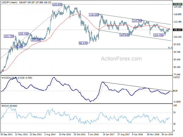 In the bigger picture, strong support was seen from 104.62 again. Yet, there is no confirmation of medium term reversal. Corrective decline from 118.65 (Dec. 2016) could still extend lower. But in that case, we’d expect strong support above 98.97 (2016 low) to contain downside to bring rebound. Meanwhile, on the upside, break of 112.40 key resistance will be a strong sign of start of medium term up trend.