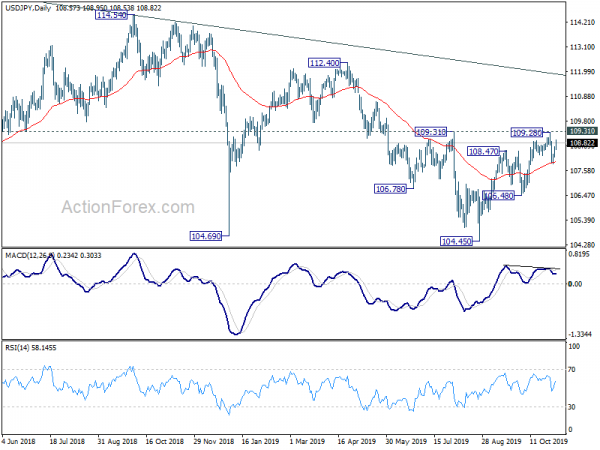 USD/JPY is still staying in range below 109.28 and intraday bias remains neutral. We’re still favoring the case of short term topping at 109.28, and expect another fall. On the downside, break of 107.88 will target 106.48 support. Break will confirm completion of whole rebound from 104.45 and target retest of this low. However, decisive break of 109.31 will be an early sign of medium term reversal and target 112.40 resistance next.