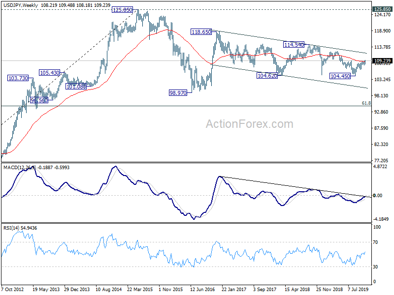 USD/JPY’s break of 109.28 resistance last week indicates resumption of whole rise from 104.45. Initial bias remains on the upside this week. Sustained trading above 109.31 structural resistance will add to the case of medium term reversal. Next near term target is 100% projection of 104.45 to 108.47 from 106.48 at 110.50. On the downside, below 108.64 minor support will turn intraday bias neutral first. But near term outlook will stay cautiously bullish as long as 107.88 support holds.