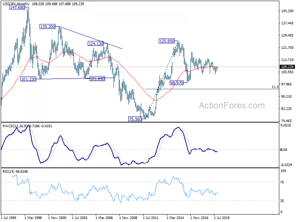 In the bigger picture, strong support was seen from 104.62 again. Yet, there is no confirmation of medium term reversal. Corrective decline from 118.65 (Dec. 2016) could still extend lower. But in that case, we’d expect strong support above 98.97 (2016 low) to contain downside to bring rebound. Meanwhile, on the upside, break of 112.40 key resistance will be a strong sign of start of medium term up trend.