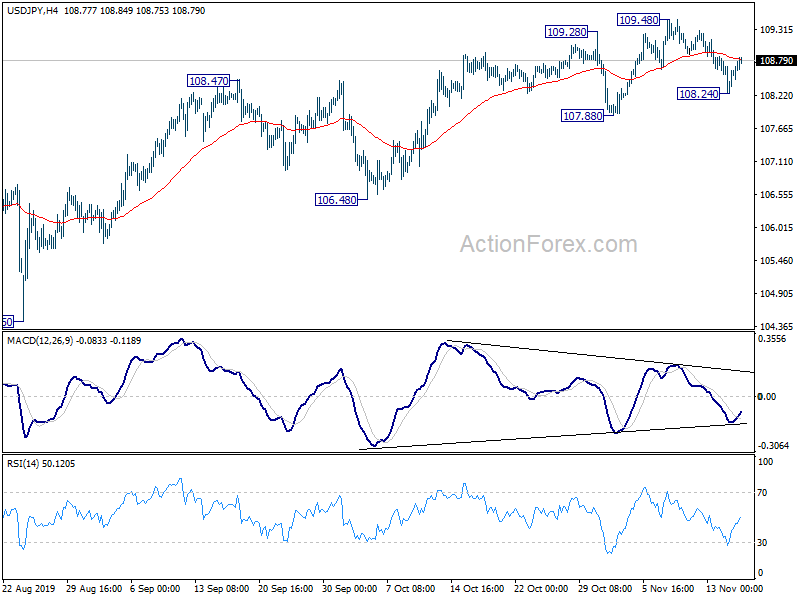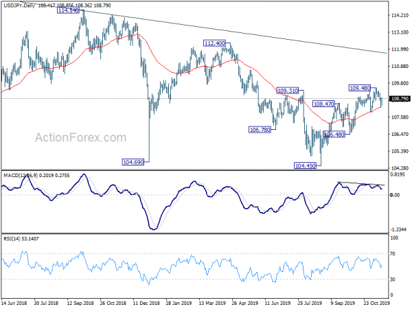 USD/JPY dropped to 108.24 last week but recovered since then. Initial bias is neutral this week first. Rise from 104.45 could have completed at 109.48, on bearish divergence condition in 4 hour and daily MACD, after failing to sustain above 109.31 structural resistance. On the downside, break of 107.88 support will affirm this bearish case and target 106.48 support next. For now, risk will stay on the downside as long as 109.48 holds.