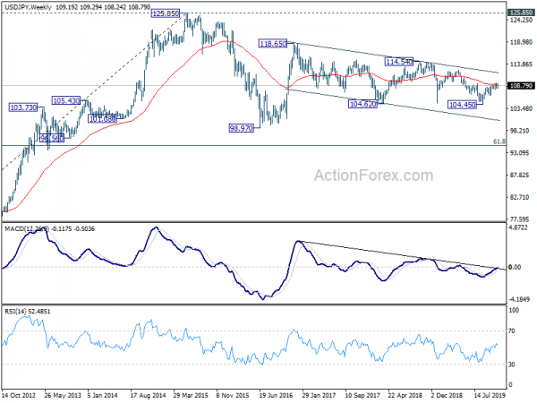 In the bigger picture, strong support was seen from 104.62 again. Yet, there is no confirmation of medium term reversal. Corrective decline from 118.65 (Dec. 2016) could still extend lower. But in that case, we’d expect strong support above 98.97 (2016 low) to contain downside to bring rebound. Meanwhile, on the upside, break of 112.40 key resistance will be a strong sign of start of medium term up trend.