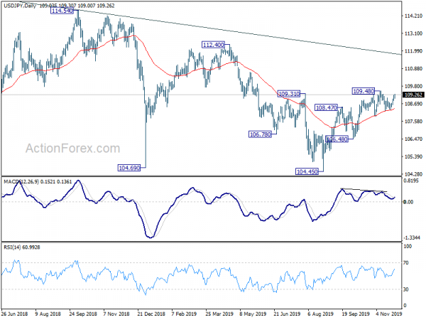 USD/JPY rises further today but stays below 109.48 resistance. Intraday bias remains neutral first and more sideway trading could be seen. Further rise in favor after drawing support from 55 day EMA. On the upside, break of 109.48 resistance will resume whole rise from 104.45 and target trend line resistance (now at 111.79). On the downside, break of 108.24 support will revive the case of short term reversal. Intraday bias will be turned back to the downside for 107.88 support to confirm.