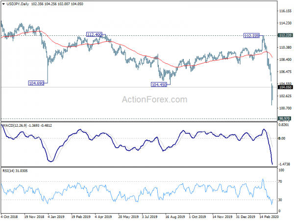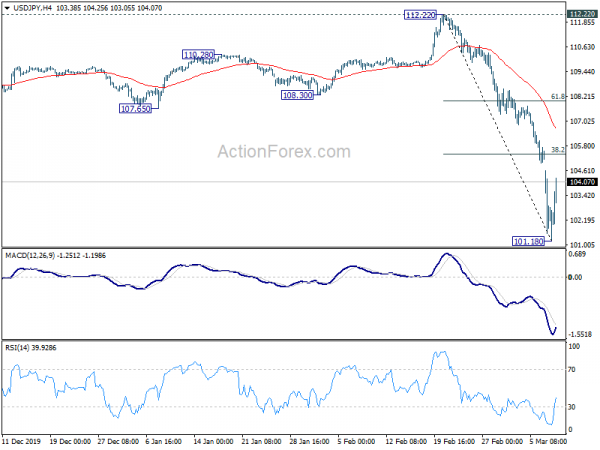 A temporary low is in place at 101.18 in USD/JPY with today’s recovery. Intraday bias is turned neutral for consolidations first. Upside should be limited by 38.2% retracement of 112.22 to 101.18 at 105.39. On the downside, break of 101.18 will resume larger down rend to next key support level at 98.97. Though, firm break of 105.39 will bring stronger rebound to 61.8% retracement at 108.00.