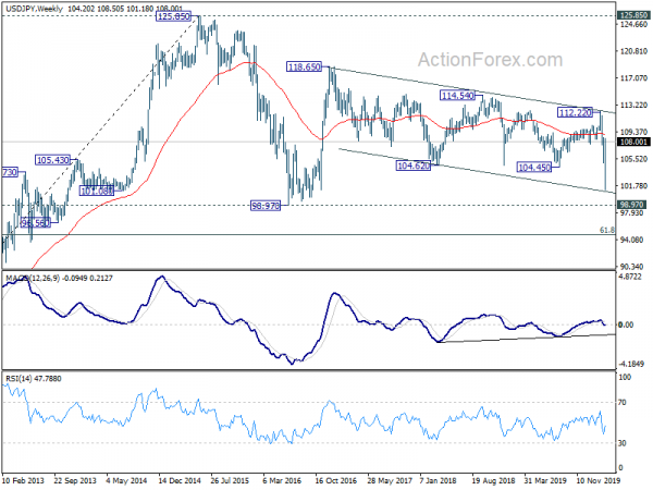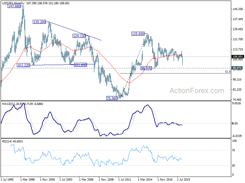 In the bigger picture, fall from 118.65 (Dec 2016) is still in progress. It’s seen as part of a larger consolidative pattern from 125.85 (2015 high). Such decline could could extend through 98.97 (2016 low). For now, risk will remain on the downside as long as 112.22 resistance holds, even in case of rebound. However, break of 112.22 will be a strong sign on medium term bullish reversal.